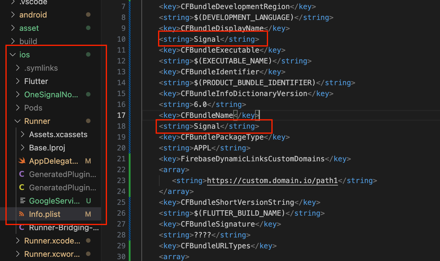 - In your project directory, go to "ios/runner/info.plist". Find "CFBundleDisplayName" & "CFBundleName", Replace Signal" to yourApp-Name