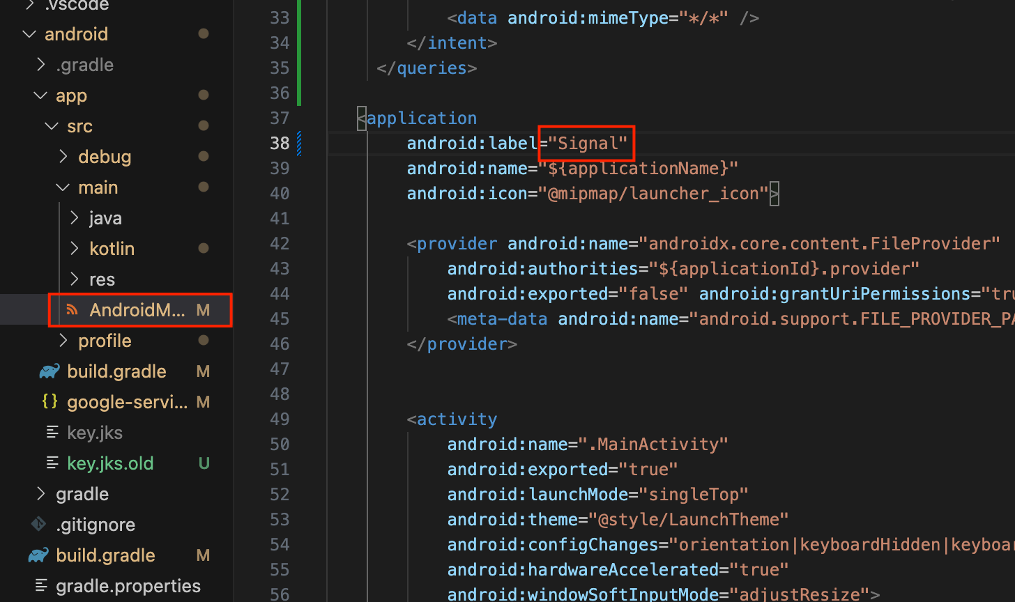 Find android:label="Blogit" and replace Blogit" to "{App-Name}" - Under Signal Project, Go to "android > app > src > main > AndroidManifes.xml"