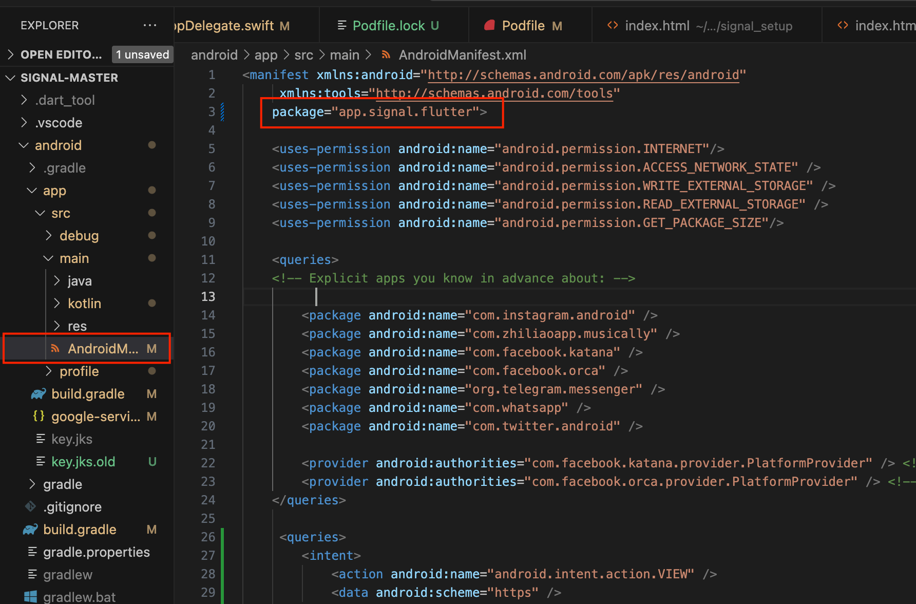 - In your project directory, go to "android/src/main/res/androidmanifest.xml".