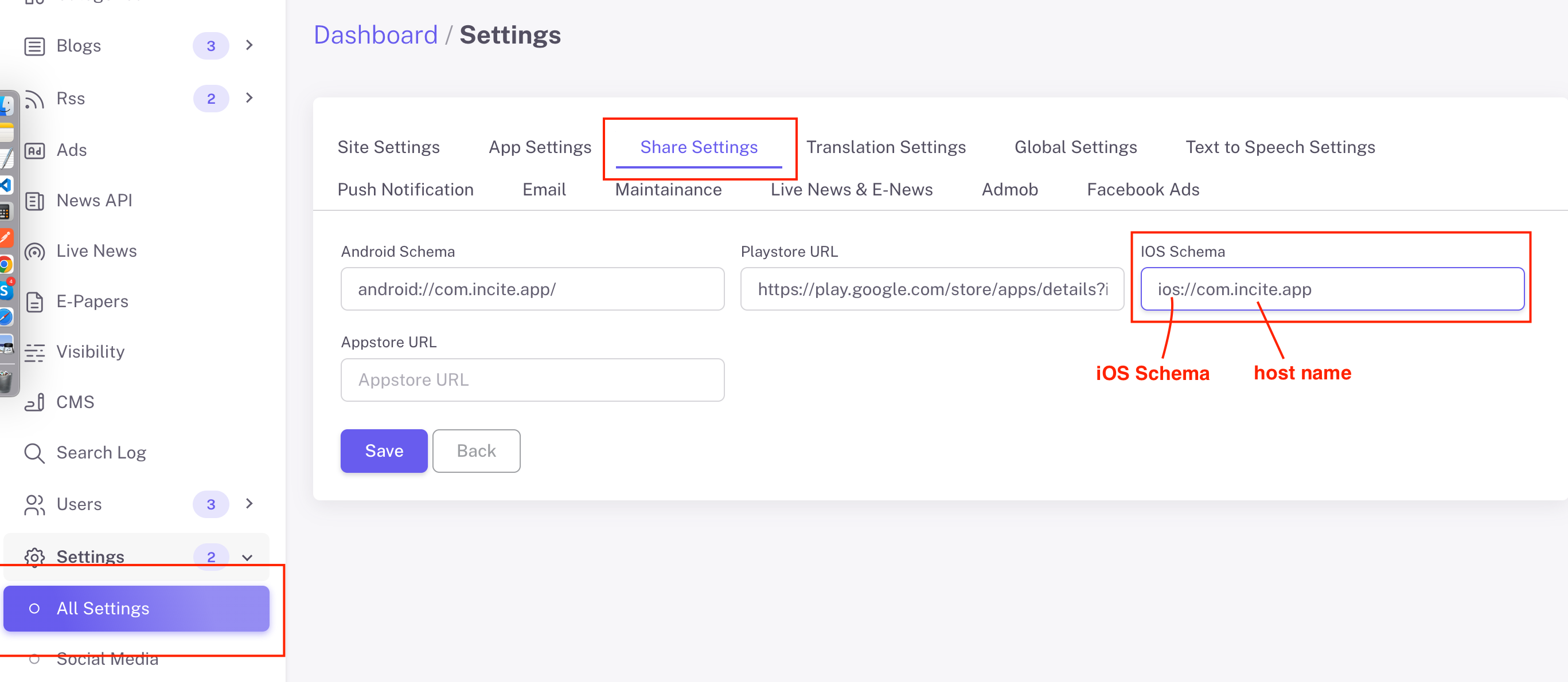 - Do the same in the Admin section, Go to Dashboard > Settings > Share Settings, 'iOS Schema' to add ios://your.custom-url.example, where 'ios' is the 'schema' and 'your.custom-url.example' is your host
