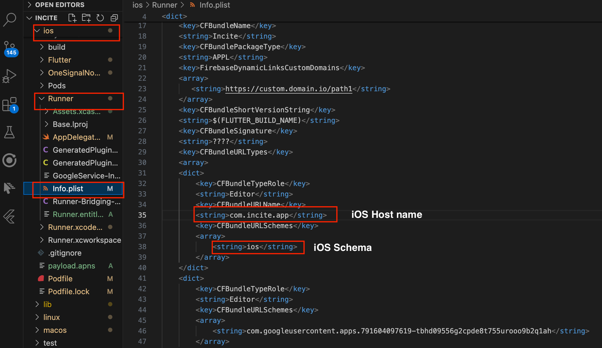 - Change 'com.incite.app' given under 'CFBundleURLName' and change it with 'your.custom-url.example'. It is the host of your deep link.