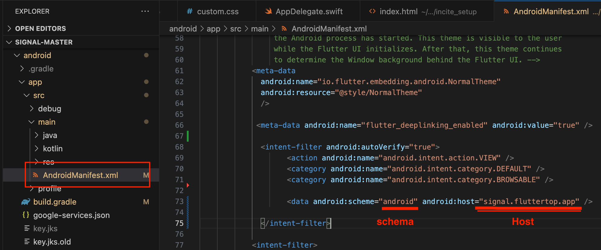 Find & Changeandroid:schema="{custom-schema}" & android:host="{custom-host}"
