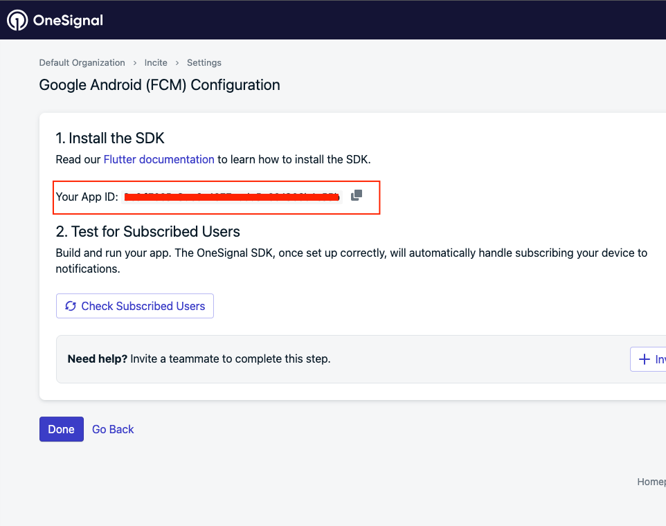 paste it to Signal Admin : Settings > Push Notifications inside "One Signal key" - Go to main.dart, look for OneSignal.initialize("here add your onesignal app id") in the code at line 126. Add the notification that you have for your project
