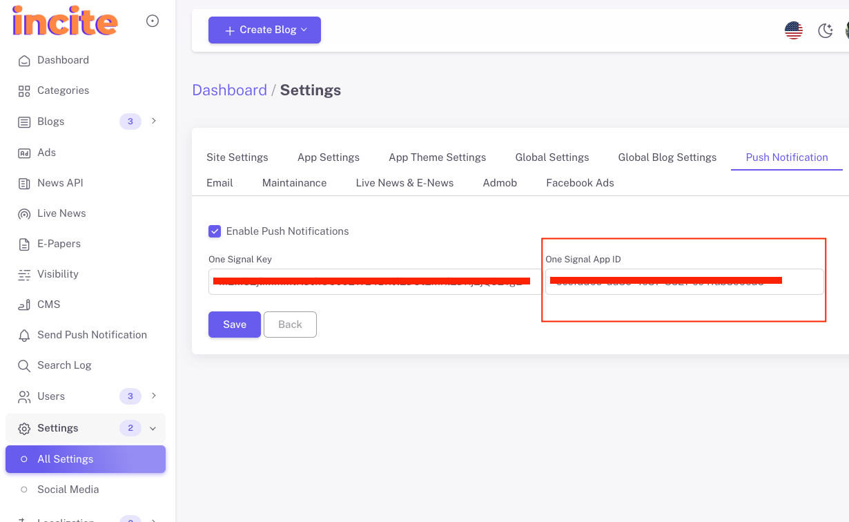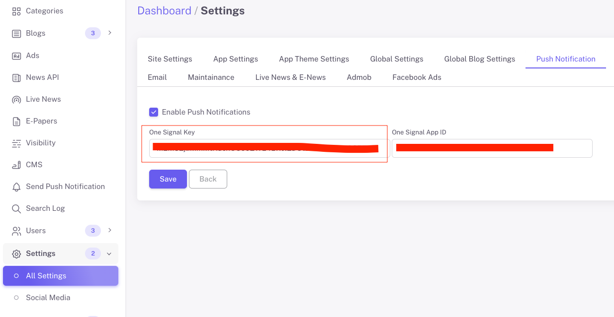 - Copy "App Id" and paste it to Admin settings under "Push notifications" Tab as per screenshot given below :