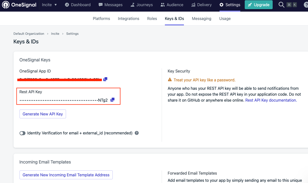 - OneSignal : >Go to Settings > Keys & IDs, Copy "REST api key"from OneSignal
