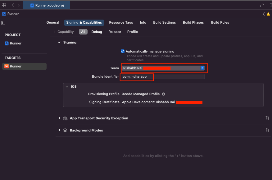 Double-Tap on "Runner.xcworkspace" to open "Xcode" - Click on "Team section", then Click +"Add an Account" and Login to your Apple account