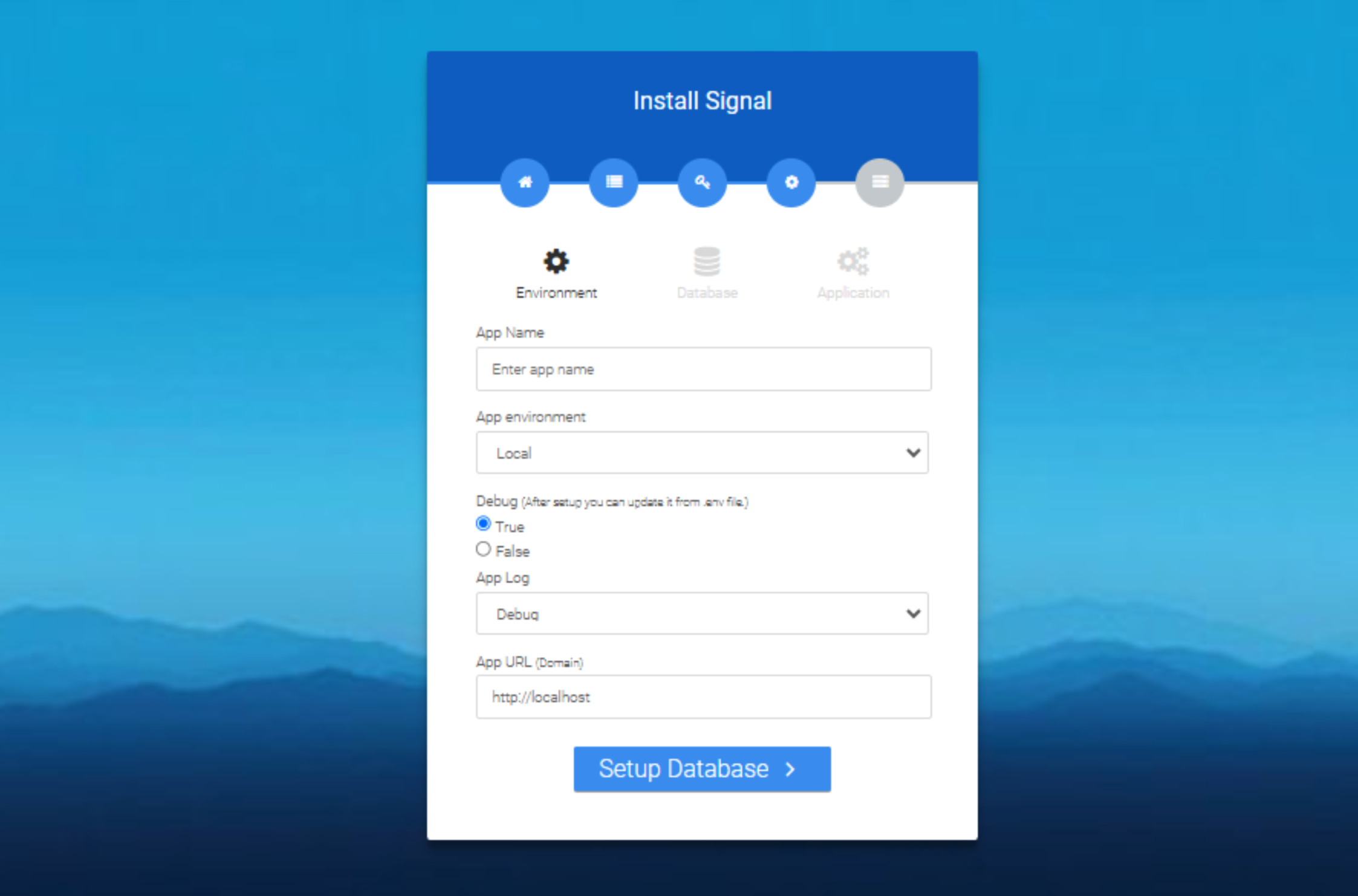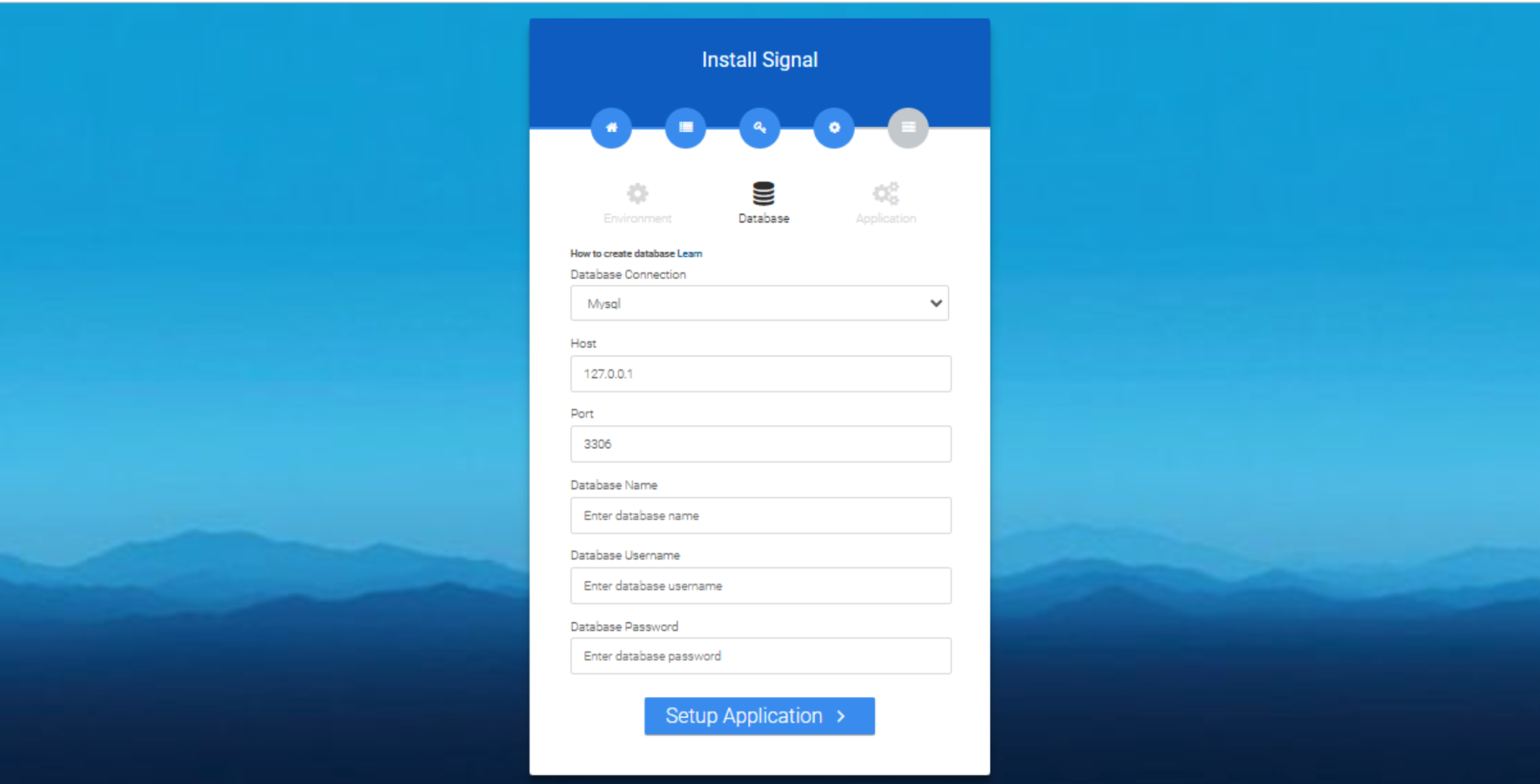 - After creating the database credentials, use them in the next step. Put the credentials in the respective fields and click on 'Setup Application'.