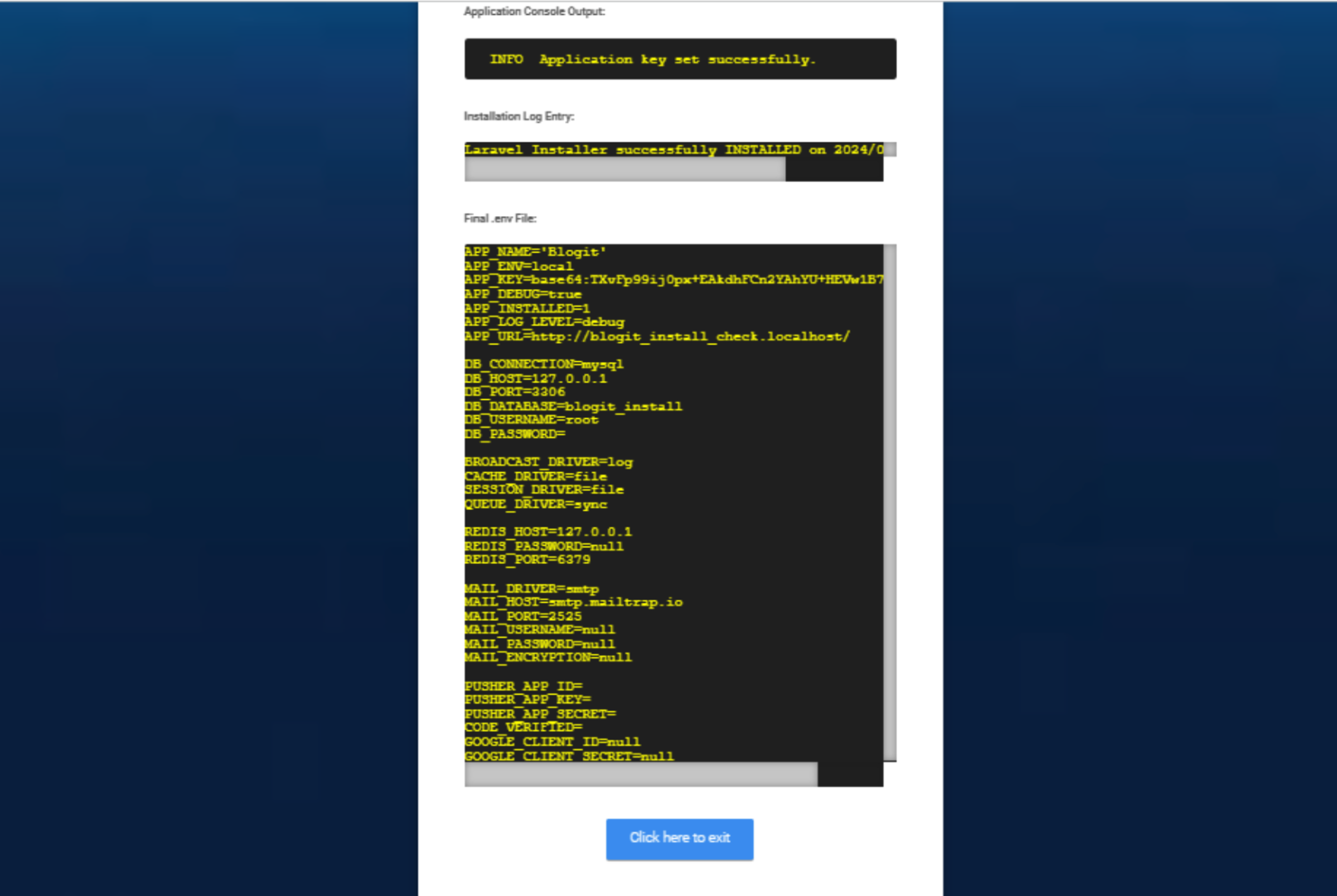 - When the popup appears with 'Installation success' at the top, click on 'Click here to exit.' You will be redirected to the next step.