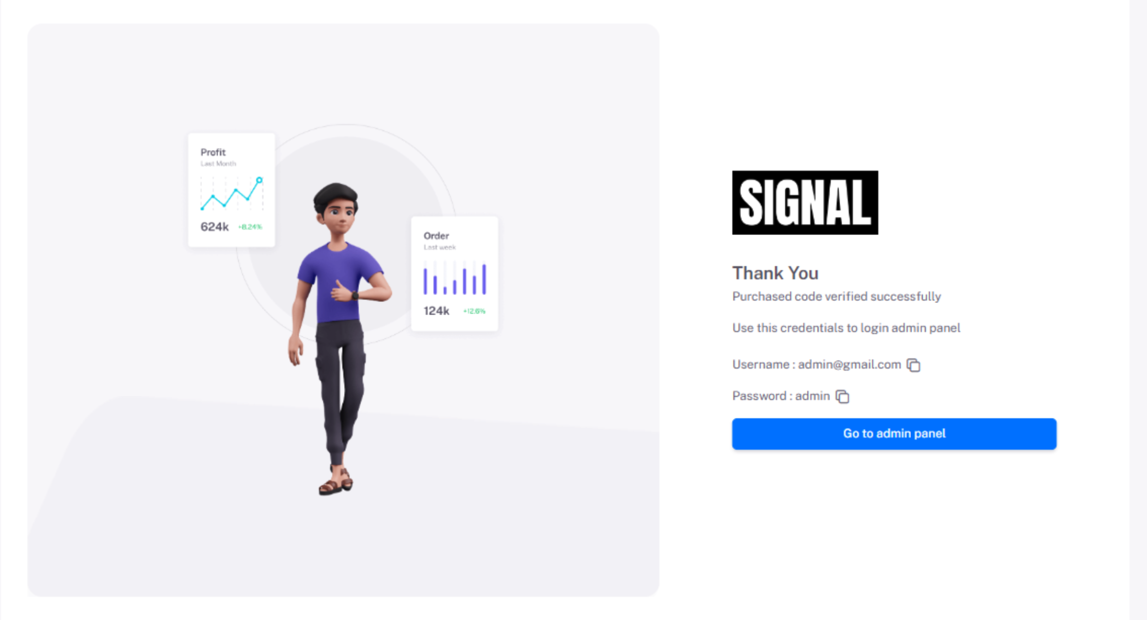 From here, please copy and save the admin credentials so you can log in during the next step. - Enter the email and password of the admin that you saved from the previous step.