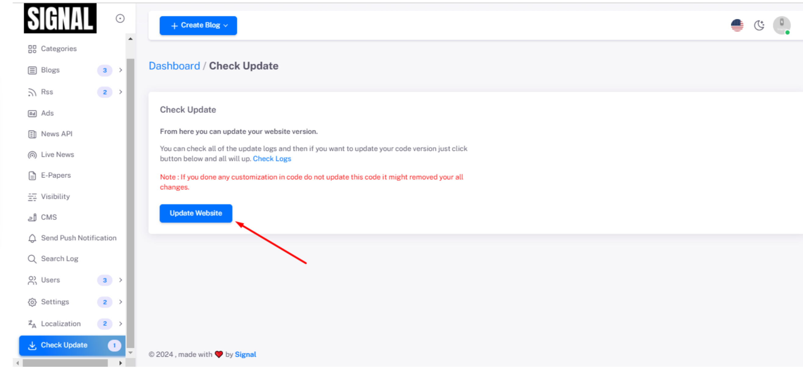 - Navigate to the 'Update Website' option, where you'll find the 'Update Site' button. Clicking on this button will update your site with our latest changes, including any database updates.