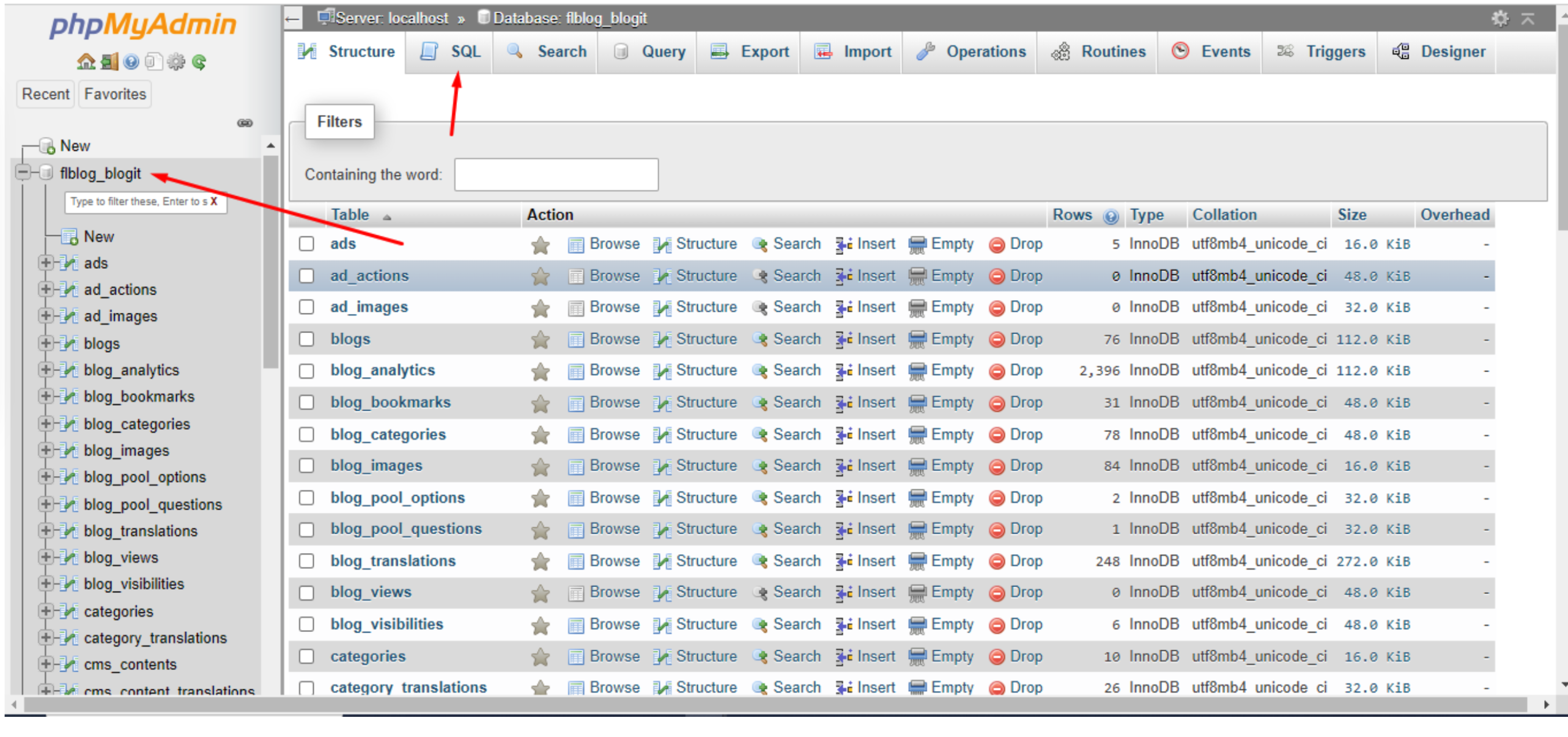- Additionally, we will provide a file with queries. Copy the queries, go to 'MySQL', and open your database. Once your database is open, you will see all your tables. Click on the 'SQL option'.