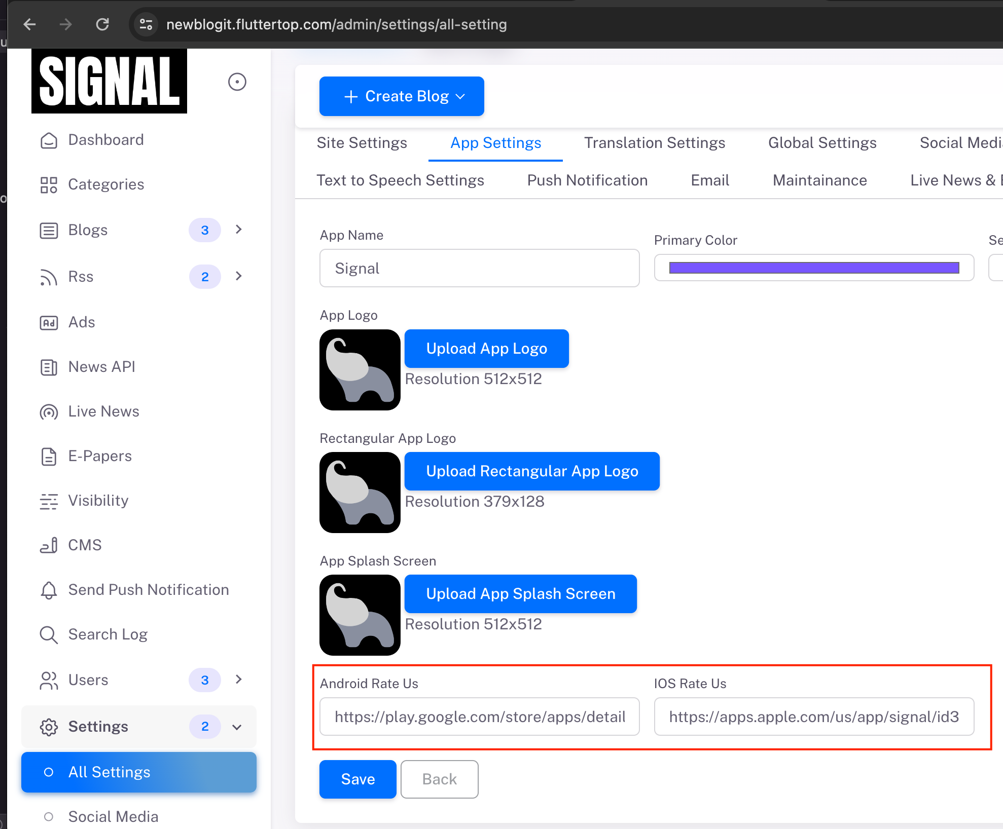 - Now Add Url to redirect to "Play Store URL for Android" and "App Store for iOS" as given in below screenshot :