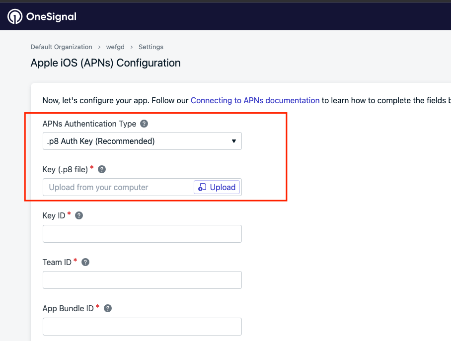 - Add p8 certificate (not p12 certificate) which you have generated from Apple developer account.
