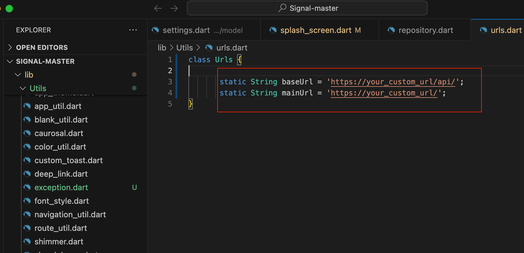 - Navigate to "lib/urls/url.dart"and change values for "baseUrl" and "baseServer" to your server domain.